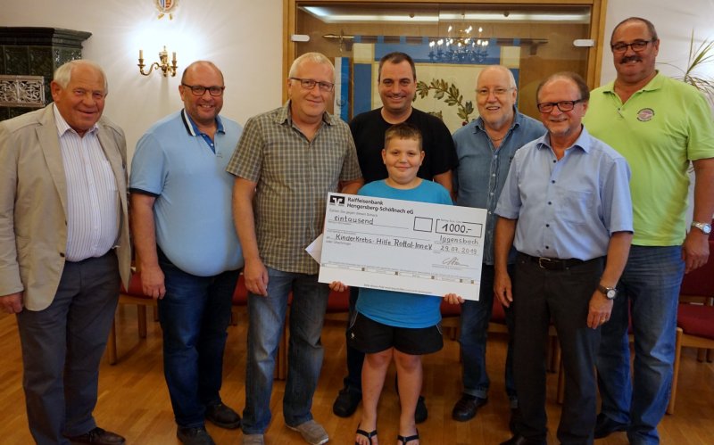 “Die Iggensbacher sind ein Segen für die KinderkrebsHilfe Rottal-Inn”: Vorsitzender Josef Hofbauer (r.) aus Pfarrkirchen durfte bei seinem Besuch im Rathaus Iggensbach eine Spende in Höhe von 1000 € in Empfang nehmen. Der Scheck wurde vom Organisationsteam des Straßenfestes, der Anlieger der Schulstraße und des Mühlfeldrings übergeben. Zu den Unterstützern der zwischenzeitlich zehn Jahre alten KinderkrebsHilfe Rottal-Inn gehört auch der Heimatsingkreis Iggensbach, der den Erlös seines Adventssingen an die gemeinnützige Organisation abführt.