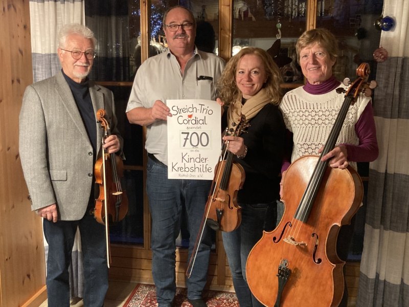 Das Streichtrio Cordial – bestehend aus Silvia Maier aus Hebertsfelden (Violine), Kurt Wehle aus Gangkofen (Viola) und Elisabeth Penzel aus Pfarrkirchen (Violoncello) konnte durch zwei Konzerte, eines in Gangkofen und eines in Pfarrkirchen, den beachtlichen Betrag von insgesamt 700 € sammeln. Das Geld wurde dem Vorsitzenden der KinderkrebsHilfe Rottal-Inn, Josef Hofbauer, übergeben.