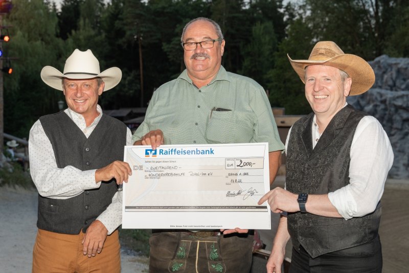 Vor der Aufführung der Karl-May-Festspiele verteilten die beiden Geschäftsführer Claus Six (Foto links) und Ernst Grünberger (Foto rechts) Spenden in Höhe von 3000 €. Davon gingen 2000 € an die KinderkrebsHilfe Rottal-Inn, die sich um Familien in den Landkreisen Rottal-Inn und Passau (mit Stadt Passau) kümmern, in denen ein Kind an Krebs erkrankt ist.